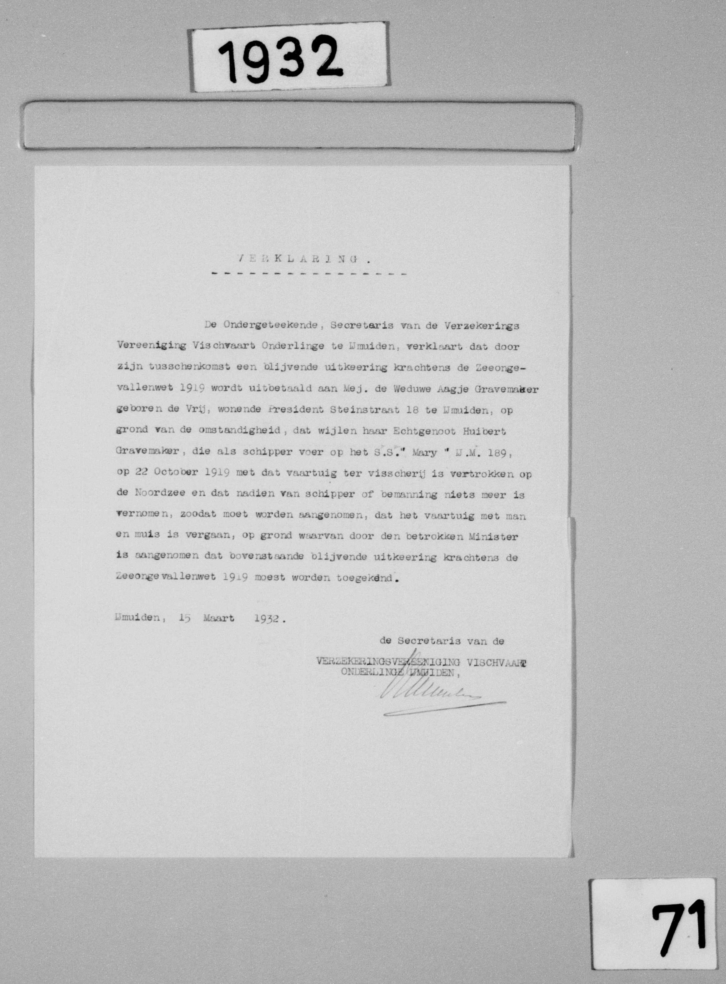 In dit document is vermeld dat de vader van Elisabeth, Schippper Huibert Gravemaker, op 22 oktober 1919 met de Mary IJm 189 is uitgevaren. Van het schip en haar bemanning is nadien niets meer vernomen zodat aangenomen moet worden dat de Mary met man en muis is vergaan. De 17-jarige zoon Rong Gravemaker was een van de bemanningsleden.