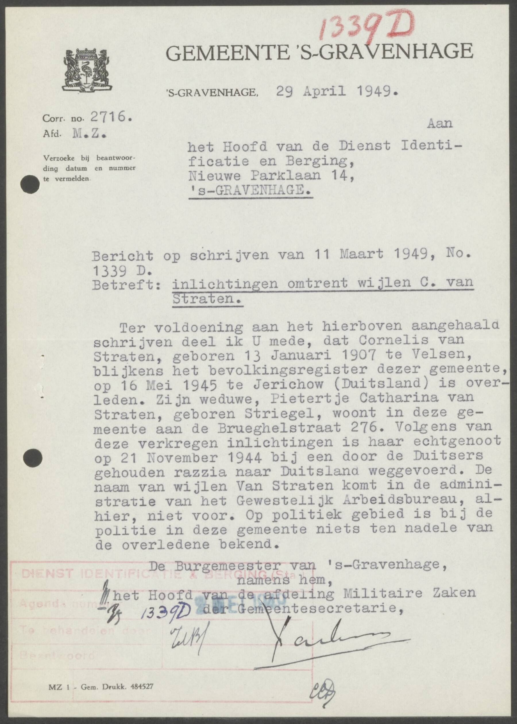 Door de Dienst Identificatie en Berging werd hij overgebracht naar Berlijn en op 21 juni 1949 overgebracht naar Nederland.